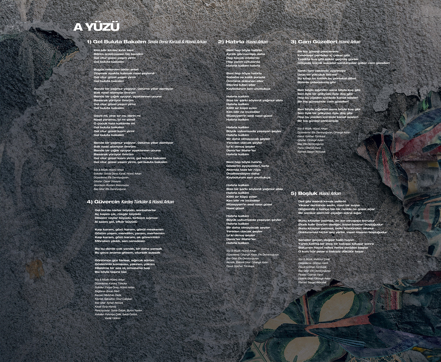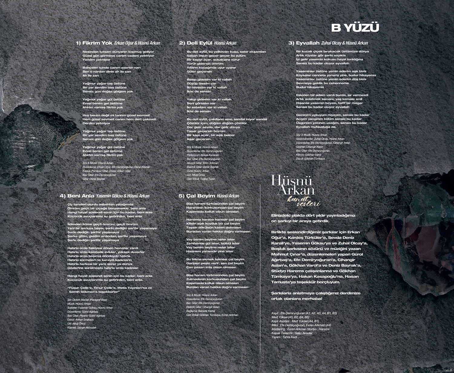 Bir Didem Madak şiiri olan Beni Anla’nın müziği Hüsnü Arkan’a ait. Mahmut Çınar şarkısı olan Boşluk dışındaki tüm sözler ve müzikler yine Hüsnü Arkan imzası taşıyor.